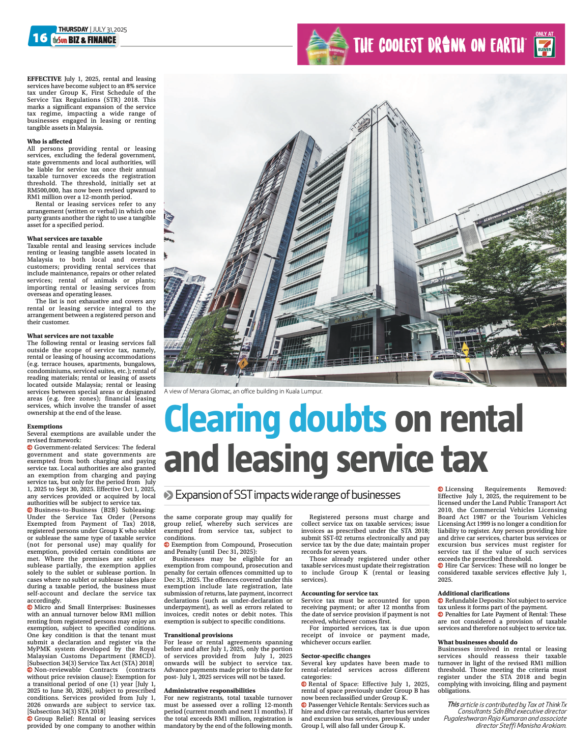 Article on rental and leasing service tax, featured in The Sun (Biz & Finance section) – 31st July, 2025